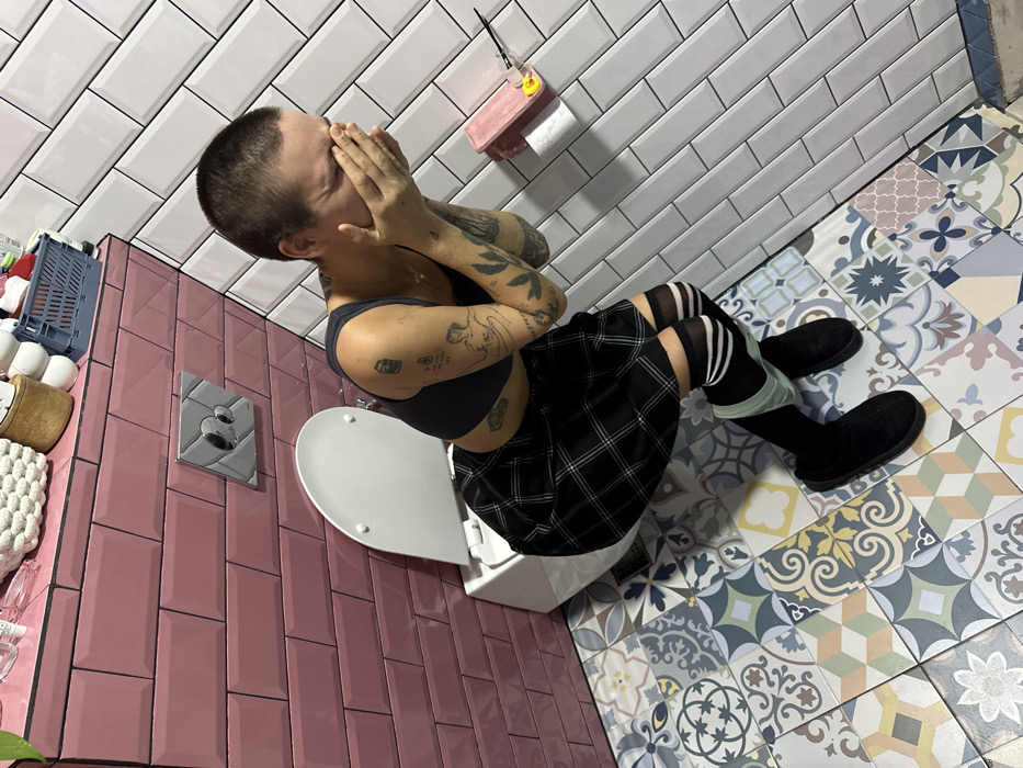 A single individual is depicted in what appears to be a bathroom. The exact location within Batumi, Georgia, cannot be determined from the image. The subject is a person with a short buzz cut hairstyle, kneeling or squatting in front of a white wall-mounted toilet. They are wearing a dark grey/black sports bra, a black and white plaid mini skirt, black thigh-high socks with three white stripes, and black slip-on shoes. Light green undergarments or shorts are visible beneath the skirt, above the socks. Multiple tattoos are visible on both arms, including a stylized figure on the left bicep and botanical designs on the right forearm. The subject's head is bowed, and their hands are covering their face, suggesting distress or nausea. The room features a patterned mosaic tile floor with geometric and floral designs in various pastel colors. The walls are tiled with pink subway tiles on the left and white subway tiles on the right, both with dark grout lines. A silver dual-flush plate is installed on the pink tiled wall above the toilet. Above the pink tiles, a pink shelf-like surface holds miscellaneous items, including a white woven basket, a small wooden pot, white ceramic objects, and a blue plastic crate. On the white tiled wall to the right, a pink wall-mounted toilet paper holder dispenses a roll of toilet paper, with a small yellow rubber duck and a clear glass containing a dark stirrer or straw placed on top.