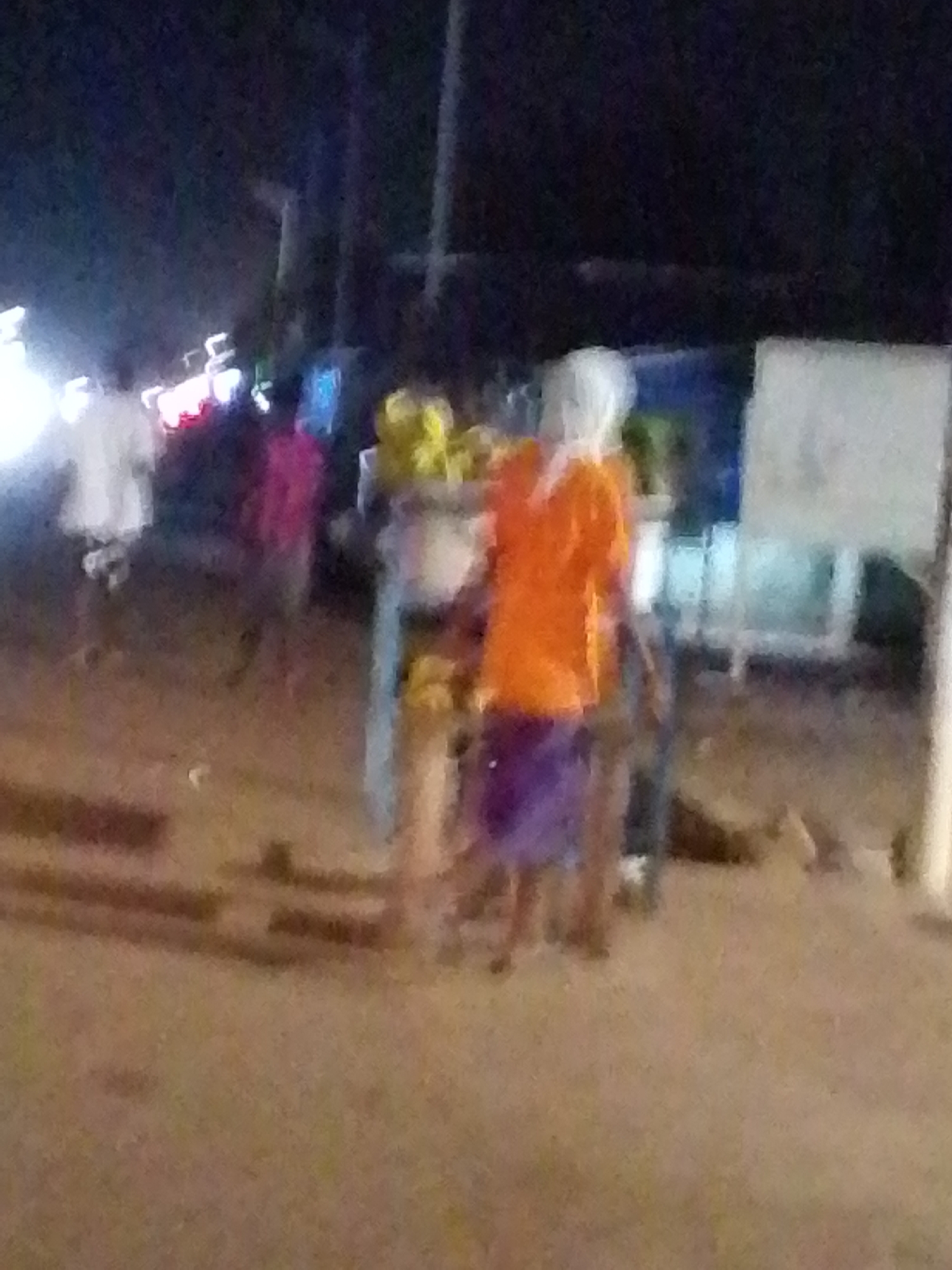 A street scene at night, possibly in Tamale, Ghana, shows a person in an orange shirt and purple wrap standing behind a cart loaded with what appears to be fruit. The person has a light-colored cloth wrapped around their head. In the background, blurred figures of people walking are visible, along with some streetlights or illuminated signs. The ground appears to be sandy or dirt. There is a light-colored object, possibly a sign, on the right side of the image.