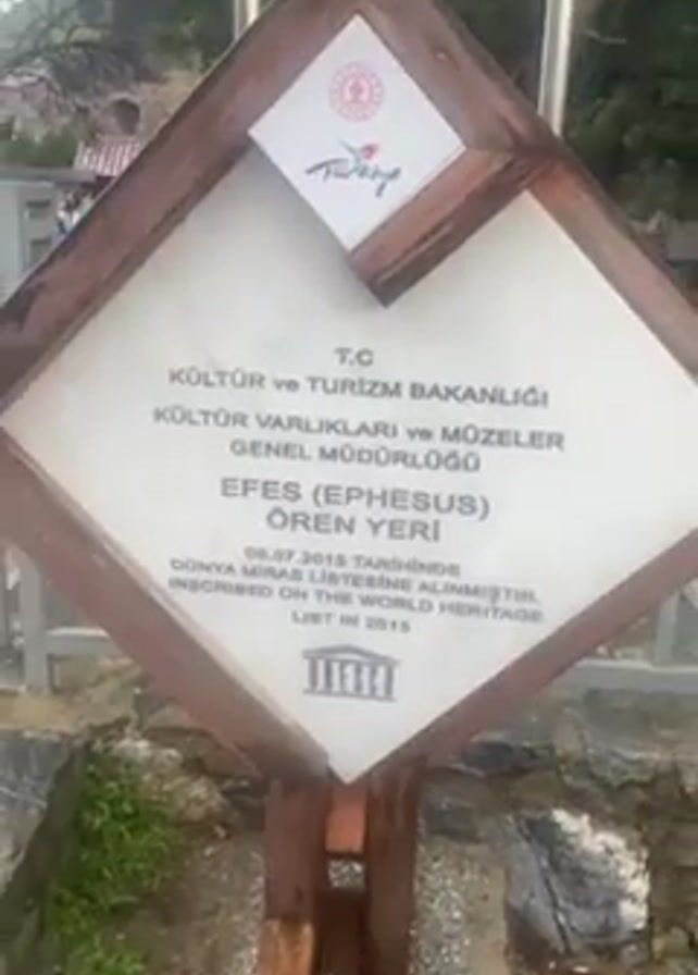 sign in Ephesus, Turkey, declaring the site's inscription on the World Heritage List in 2015. The sign, presented in both Turkish and English, is framed in wood. The camera focuses closely on the sign. The surrounding environment is natural, with greenery and stone visible. Sounds suggest there are people and water nearby.