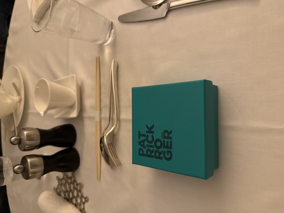 A dining table setting, located in Chiyoda, Japan, is depicted. The foreground is dominated by a rectangular teal gift box with the black "PATRICK ROGER PARIS" logo printed on its lid. Directly behind the box, a silver fork and spoon are laid parallel, with a pair of light-colored wooden chopsticks resting horizontally above them. To the upper left, two dark, conical salt and pepper grinders with metallic caps stand next to a rolled white napkin and a metallic, open-work coaster. A small white creamer or pouring vessel sits on a square white dish further to the right. A clear glass filled with water and ice is positioned to the right of the creamer. A silver table knife and a second spoon are partially visible on the far right. A white teacup and saucer are discernible in the blurred upper background. All items are arranged on a white tablecloth. No individuals or actions are present in the scene.