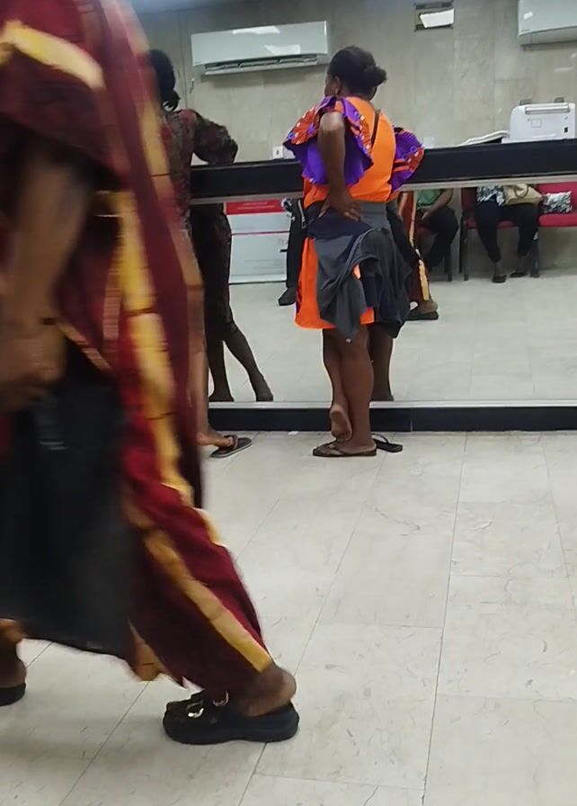 The scene unfolds inside a bank, where a group of customers stands in line at the teller window. A large mirror behind the counter reflects the patrons' backs and their attire. The floor is covered in light, neutral-toned tiles. In the background, air conditioning units are visible above the mirror, and some seating is available for customers. The light is provided by square panels in the ceiling, creating a bright and sterile atmosphere.