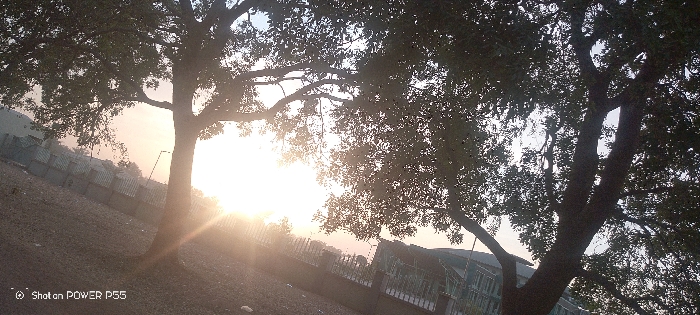 The image captures a serene sunset, diffused by two large trees framing the scene. Light flares through the leaves, casting long shadows and illuminating a landscape with a fence and a building in the background. The ground is covered with dry dirt or grass. A slight tilt suggests a low camera angle. The text "Shot on POWER P55" is present at the bottom left corner.