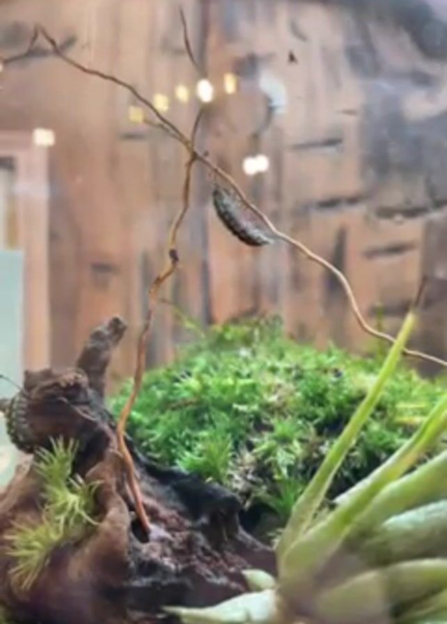 terrarium or small enclosed ecosystem. Inside the glass container, there is a piece of driftwood covered in green moss. In the foreground, there is a spiky green plant, possibly an air plant. A thin, brown branch extends upwards, and a small, dark-colored isopod, such as a woodlouse or pillbug, is clinging to it upside down. The background appears to be a textured wall, possibly a part of the terrarium setup. There are faint, blurred lights visible behind the enclosure. The camera is static and focuses on the isopod and its immediate surroundings within the terrarium.