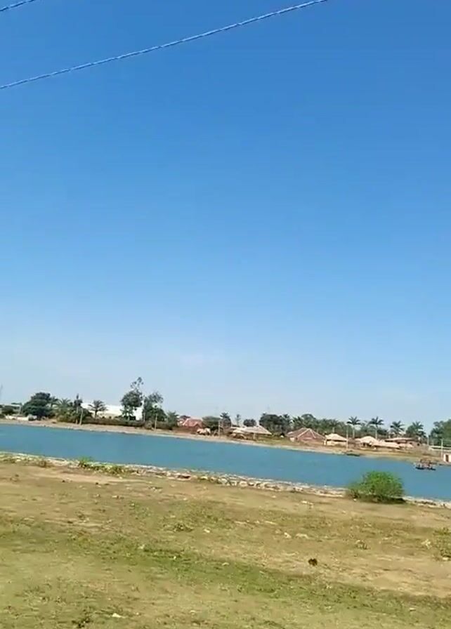 landscape under a clear blue sky. In the distance, there is a body of water with a few buildings and trees along the opposite shore. The foreground consists of a grassy area with some dry patches. There are electrical wires visible in the sky. The camera appears to be moving.