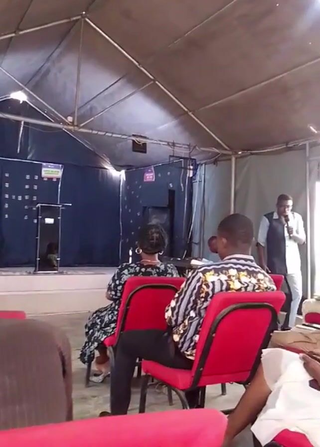The video depicts a church service taking place inside what appears to be a large tent