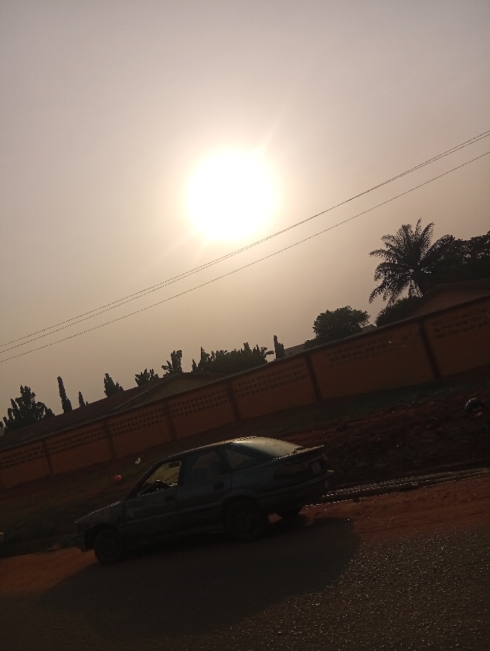 The image depicts an outdoor, static scene under a hazy, bright sky, likely during late afternoon or early morning. A prominent, intensely bright sun dominates the upper-left sky, creating significant glare. Multiple thin, dark overhead wires stretch horizontally across the mid-upper portion of the frame. Below this, a long, segmented mustard-yellow or light orange-brown concrete wall with a decorative top edge runs across the mid-ground. Behind the wall, dense green foliage and trees are visible, including a tall palm tree silhouetted on the far right. The ground immediately behind the wall is a raised bank of reddish-brown soil. In the mid-ground, a dark-colored (possibly blue or green) older model hatchback car is parked on the reddish-brown dirt shoulder of an asphalt road. The car is angled with its front toward the left, displaying signs of wear and age, including dull paint and discolored wheels. The asphalt road occupies the foreground, appearing dark and textured. No people are present, and no actions or interactions are depicted. The environment suggests a suburban or peripheral urban setting within the city of Unknown, Unknown, characterized by tropical vegetation and local infrastructure.