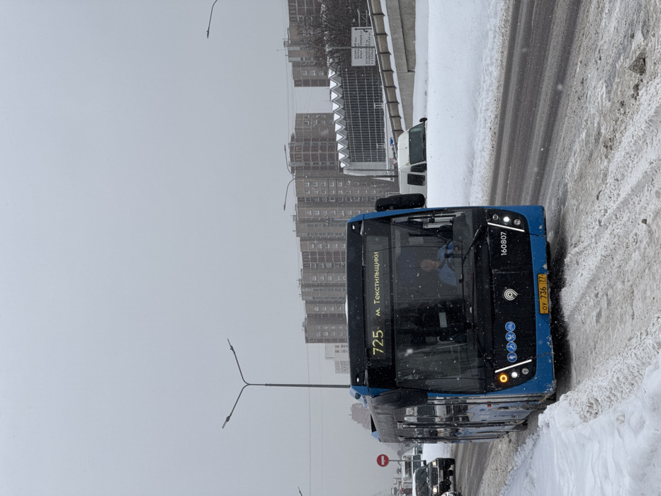 The image depicts a winter street scene in Moscow, Russia, specifically in the vicinity of the Tekstilshchiki district. A blue and black LIAZ-5292.65 city bus, displaying route "725" and destination "м. Текстильщики" (Tekstilshchiki Metro Station), is centrally positioned, traveling on a snow-covered road. The bus features Russian license plate "ОУ 736 77" and fleet number "160807". A male driver in a light blue shirt is visible through the windshield. Heavy snow accumulates on the road shoulders and median, with visible tire tracks on the asphalt road surface. In the background, a black SUV is visible to the left, while a white van is partially obscured by a deep snowbank on the right side of the road. Multi-story residential buildings, characteristic of post-Soviet architecture, line the distant horizon, along with a modern building featuring an angular roofline and glass facade. The sky is uniformly overcast and grey, with light snowfall evident. Dual-arm streetlights are spaced along the thoroughfare. A red circular prohibitory sign (likely "No Entry") is partially visible on the left side of the road.