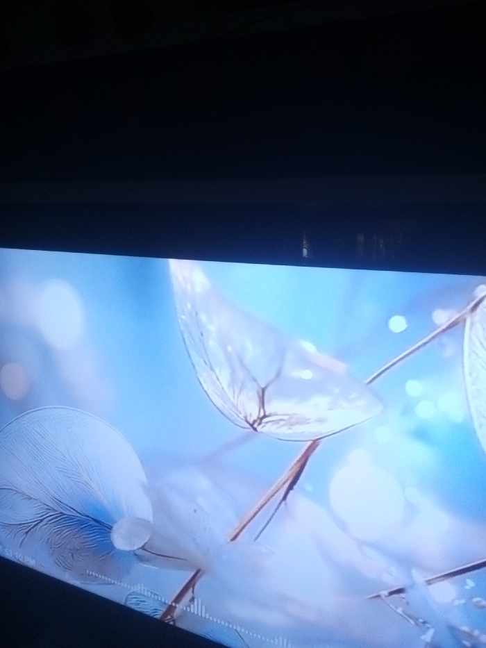 A photograph captures an electronic display screen positioned at a slight upward angle, partially obscured by dark bezels on the top and sides. The screen exhibits an illuminated digital image featuring translucent, delicate plant-like structures against a soft, light blue background with numerous out-of-focus circular light sources (bokeh). In the upper-middle and upper-right portions of the screen's content, two distinct, translucent, disc-shaped objects with visible vein patterns are observed, resembling dried seed pods. These are attached to slender, brown, linear stalks that extend diagonally across the frame. In the lower-left corner of the screen's content, a larger, feathery, white and light blue plume-like structure is visible. Several smaller, white, wispy elements are scattered in the foreground and midground. At the bottom-left of the displayed content, faint white digital text is partially visible, appearing to indicate "0:01:00." Below this, a horizontal bar features varying vertical lines, consistent with an audio visualizer or progress indicator. No individuals, direct actions, or interactions are depicted within the screen's content. The immediate environment of the photograph is dark, with no discernible details beyond the screen itself. The image depicts a screen in an unspecified interior location within the city of Unknown, Unknown.