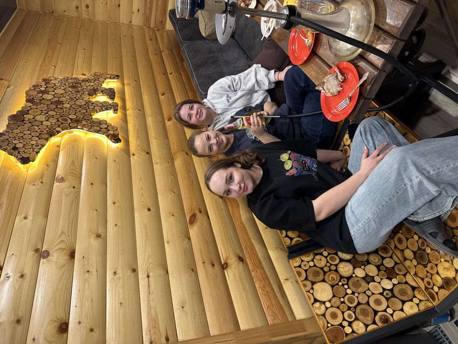 The image depicts three young adult females situated within an interior space in the city of Chaikovsky, Russia. The background wall is constructed from horizontal light-colored wooden logs. A large, illuminated bear silhouette, fashioned from various circular wooden cross-sections, is mounted on the log wall. The female on the left, with dark hair, wears a black t-shirt with a colorful graphic design and light blue jeans. She is seated on a bench featuring a surface composed of embedded circular wood cuts. The central female, also with dark hair, wears a dark blue t-shirt and blue jeans, holding a brown glass beer bottle, and is seated on the same wood-cut bench. The female on the right, with brown hair, wears a light grey hooded sweatshirt and dark trousers, and is seated on a dark grey upholstered sofa. All three individuals are looking towards the camera. A dark wooden table occupies the foreground, displaying two red paper plates: one contains a piece of bone-in meat and a silver fork, while the other is mostly empty. A glass hookah, equipped with a black hose and mouthpiece, is positioned on the table, alongside a small clear glass bottle.