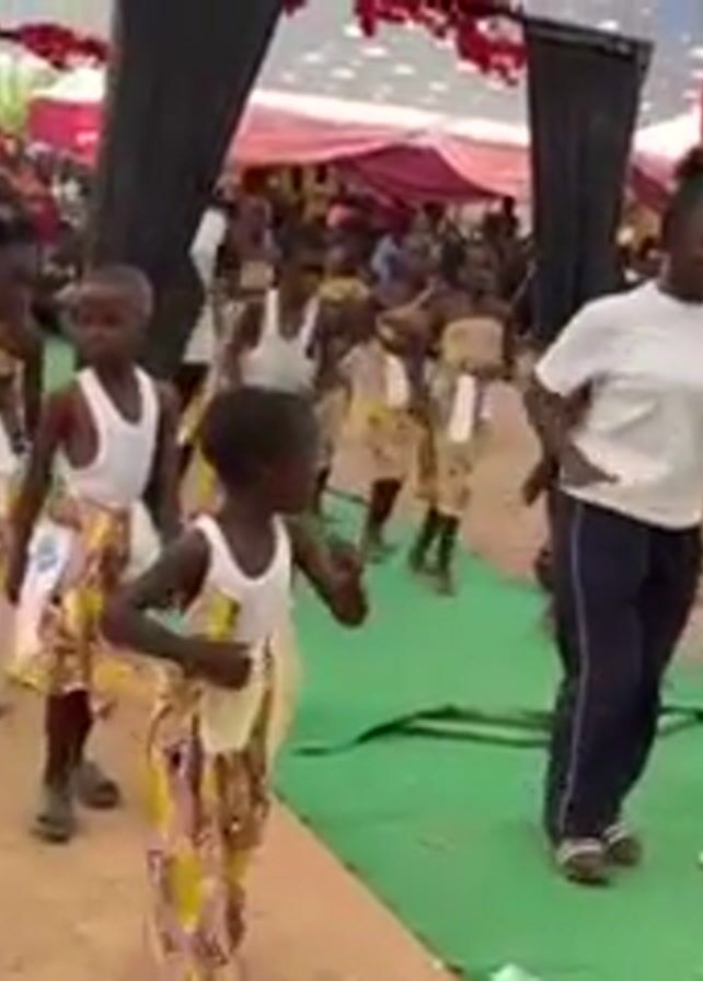 A group of children is performing a choreographed dance, with a woman acting as the leader. They are dancing on a green carpet under a tent-like structure adorned with red and white fabric. The children are dressed in matching outfits: white tops and patterned skirts. The woman is wearing a white t-shirt and dark pants. The audience is visible on the right side of the frame, seated and watching the performance. The camera is positioned low, capturing the dance from a close perspective.