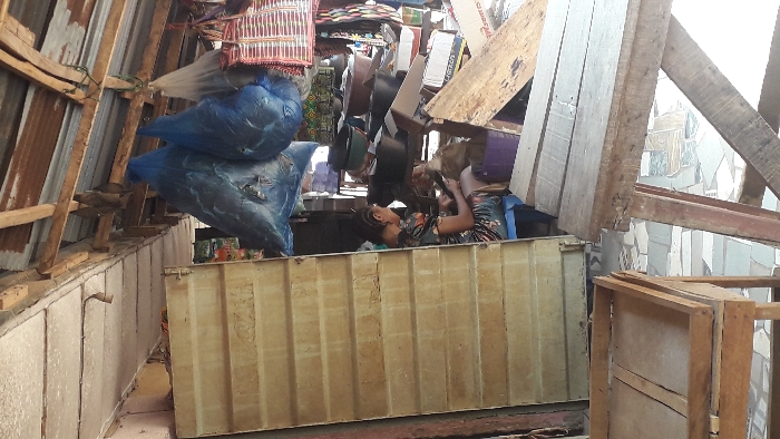 The image displays the interior of a market stall or shop located in Onitsha, Nigeria