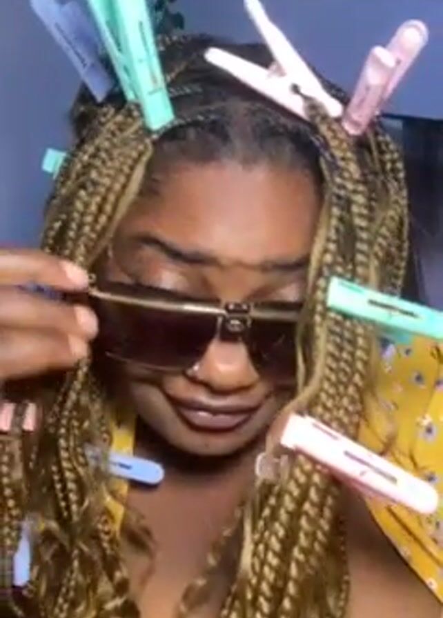A woman wearing sunglasses and a yellow patterned top is applying lip liner in the video. She has blonde braids with several pastel-colored clothespins clipped to them. A plant and a framed picture are visible in the background.