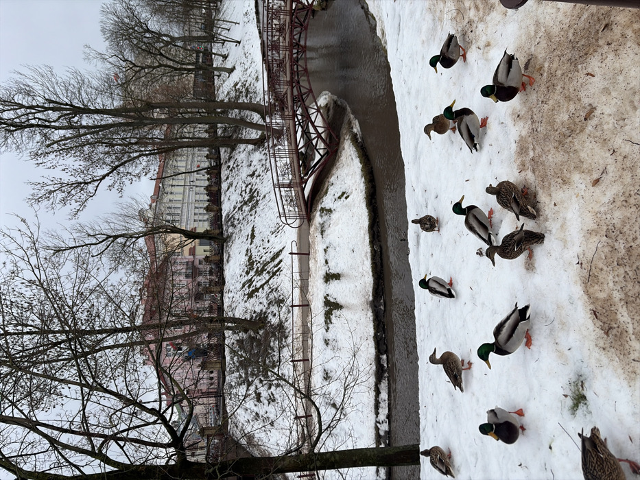 The image depicts a winter scene in Gilibert Park, Hrodna, Belarus, under an overcast sky. The ground and embankments are partially covered in snow, interspersed with patches of exposed brown earth. In the foreground, a group of approximately fourteen mallard ducks stands on the snow. This group includes both male mallards, identifiable by their iridescent green heads and grey bodies, and female mallards, characterized by their mottled brown plumage. The ducks are stationary. A dark, narrow canal flows through the midground, its banks lined with snow. On the right side, an arched pedestrian bridge made of dark red, decorative metalwork spans the canal. Beyond the canal, a snow-covered embankment rises, topped by a dark railing and several bare deciduous trees. In the background, a series of multi-story buildings is visible. The most prominent structure on the left is a pale pink building featuring white architectural trim and balconies. To its right, a cream-colored building with a similar architectural style is present. No people are visible in the scene.