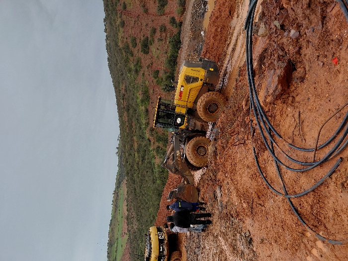 A muddy construction site is shown, with a yellow front-end loader positioned on the right side of the frame. Several workers stand near the loader. In the foreground, black cables are scattered on the ground. The soil is reddish-brown, and there are rocks and debris visible. In the background, a hillside covered in vegetation slopes upwards, and the sky is overcast.
