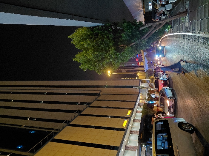 This nocturnal image depicts a bustling street scene in Makkah Al Mukarramah, Saudi Arabia, characterized by urban architecture and active pedestrian and vehicle traffic. A prominent, tall, modern building, likely a hotel or commercial complex, dominates the left side of the frame, featuring a facade with vertical dark-striped windows contrasting with lighter, possibly beige, wall panels. A partially visible illuminated sign near its entrance reads "Movenpick" or a similar variant. A dark tour bus and a white passenger van are positioned near the building's entrance, with several individuals, some in traditional white thobes, gathered nearby. The asphalt street, visible in the foreground and mid-ground, appears wet, reflecting artificial lights from vehicles and streetlights, suggesting recent precipitation or cleaning. Traffic is evident, with multiple vehicles including a light-colored sedan with headlights on and a red-orange van queuing or moving slowly. Further down the road, numerous vehicle headlights and taillights illuminate the distant street. In the mid-ground, a person dressed in a dark, possibly blue, full-length abaya, is captured mid-stride crossing the wet street from the right side towards the left. Their back is largely to the viewer, with their head slightly turned left. To the right, a paved sidewalk with planted trees runs parallel to the street. One tree with green foliage leans prominently over the sidewalk. A group of individuals is seated on benches or ledges along this sidewalk, some dressed in white garments, others in darker attire. Overhead, a large, bright yellow streetlight illuminates the intersection beyond the pedestrian. The sky is dark, indicating nighttime conditions.