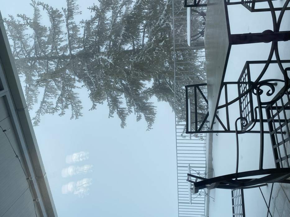 The image captures an outdoor patio or terrace in Gabrovo, Bulgaria, under severe winter conditions