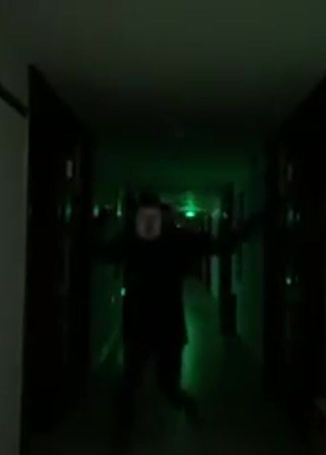A figure wearing a black coat, hat, and a white mask with red and black markings runs down a dimly lit hallway toward the camera. The hallway has dark doors on either side and framed artwork on the walls. The lighting in the hallway appears to be green. The figure raises its arms as it approaches the camera.