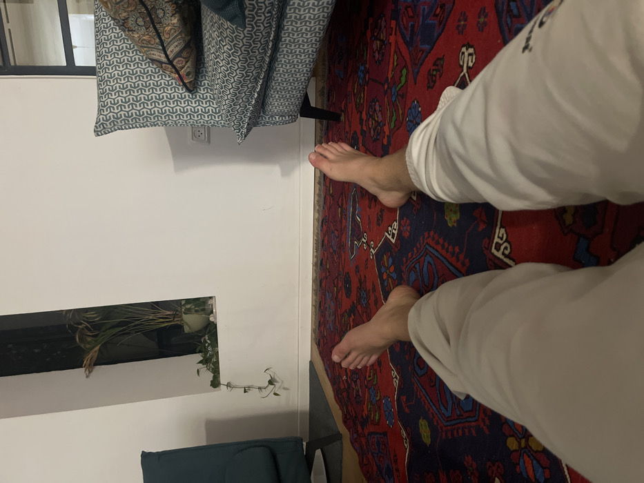The image captures an indoor scene within a residence in Modiin-Maccabim-Reut, Israel, from a first-person, low-angle perspective. In the foreground, the bare feet and lower legs of an individual, clad in light-colored trousers, are visible. The feet rest upon a large red rug featuring intricate dark blue, green, and light blue traditional patterns. The floor beneath the rug is dark. The background consists of white walls. To the left, a portion of a dark teal upholstered chair or sofa is present. A vertical recessed opening in the white wall contains two potted plants: one with upright, larger leaves and another with smaller, trailing foliage. To the right, an armchair upholstered in a light blue or grey fabric with a repeating geometric pattern is visible, adorned with a patterned cushion. An electrical outlet with two circular sockets is mounted on the white wall adjacent to the armchair. A dark-framed window or door section is partially visible in the upper right.