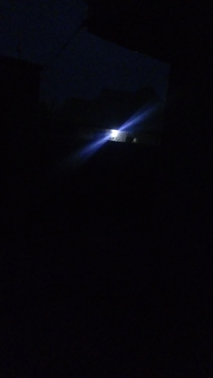 A stark, dark scene reveals a night view with minimal visibility. The upper portion shows vague shapes suggesting a building or structure against a dark sky. A bright, possibly artificial, light source shines in the distance, casting a blue-toned glare. The foreground is almost entirely black, obscuring any detail, emphasizing the darkness.