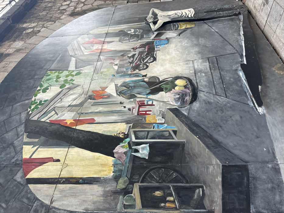 This image displays a large outdoor mural depicting a street scene, affixed to a textured, grey, arched wall structure. The mural illustrates a traditional urban environment, characteristic of the Old Quarter in Hà Nội, Vietnam. **Mural Content:** * **Foreground (Left):** A dark-colored street vendor's cart with a large wheel, equipped with shelves holding various bottles and containers. A white plastic bag hangs from the cart. * **Foreground (Center):** A person wearing a traditional conical hat (nón lá) and light-colored clothing walks towards the viewer's right, carrying a shoulder pole (quang gánh) with two baskets. The baskets contain assorted produce, including green vegetables and yellow items, some enclosed in clear plastic bags. * **Foreground (Right):** A figure in a light-colored short-sleeved shirt leans against a wall, with hands clasped behind their head. A yellow bucket stands next to this figure. * **Midground:** The scene depicts a narrow street with several parked motorbikes/scooters. Indistinct figures are visible, some sitting on small red stools near roadside setups. Blue and yellow buckets are placed on the ground next to these areas. * **Background:** Buildings line the street, featuring windows and some green foliage overhead. Multiple red Vietnamese flags with a yellow star are displayed from the buildings. Red fabric pieces are also depicted hanging on lines. * **Overall Ambiance:** The mural employs a somewhat muted color palette, primarily greys, blues, and browns, with accents of red, yellow, and green. The style is illustrative, portraying daily life. **Physical Location and Context:** The mural itself is physically located in the city of Hà Nội, Vietnam, likely an area such as Phùng Hưng Mural Street or a similar public space under a railway arch or bridge. The arched structure it is painted on is composed of grey, roughly hewn stone blocks. The ground directly beneath the mural is paved with grey square tiles, showing some wear. The bottom edge of the mural exhibits minor damage or peeling.