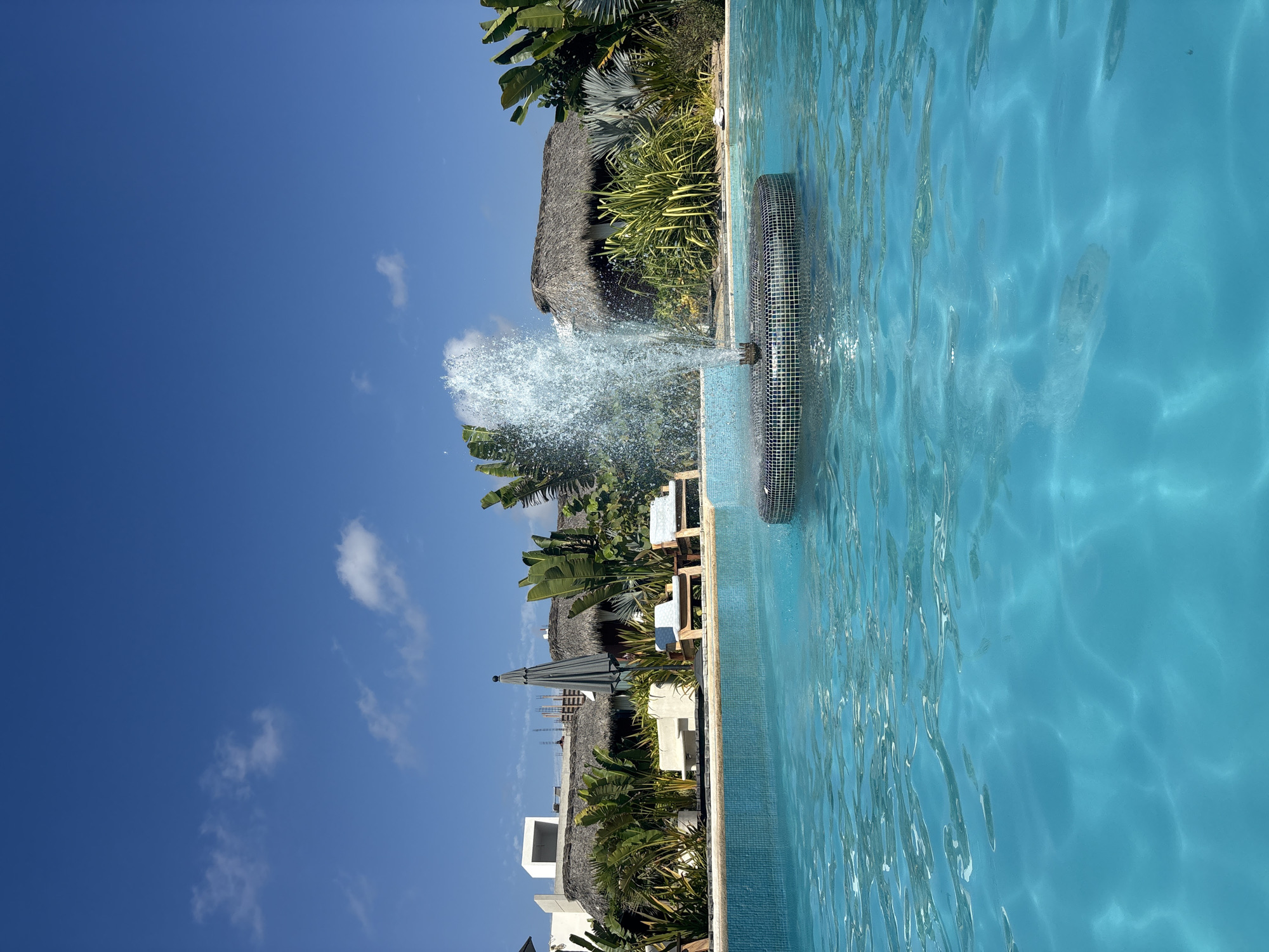 The image captures a vibrant outdoor scene next to a swimming pool in El Jícaro, Mexico. A water fountain feature is active, spraying water into the pool. The sky is clear and blue with some scattered clouds. Thatched-roof structures, possibly cabanas or buildings, are visible in the background amidst tropical vegetation, including palm trees and other greenery. Patio furniture, including lounge chairs and an umbrella, suggests a relaxation area near the pool. The pool water appears clear and turquoise, reflecting the sunlight.