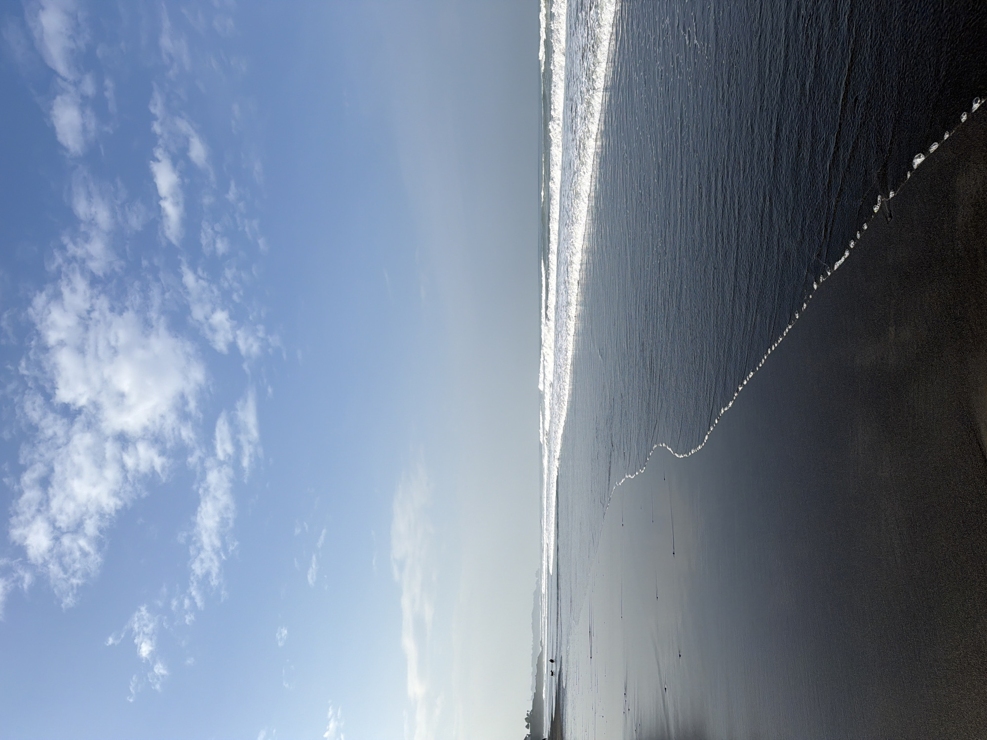 The image displays a coastal scene in Sudimara, Indonesia. A wide expanse of dark grey to black wet sand, highly reflective of the sky, occupies the foreground and left side of the frame. A serpentine line of white seafoam marks the current waterline, extending diagonally from the lower right corner towards the distant upper left. The ocean, characterized by dark grey-blue water with multiple parallel lines of breaking white-capped waves, occupies the mid-right section. The sky above is light blue with scattered white cumulus clouds. In the far distance along the left shoreline, two indistinct human figures are observed walking on the wet sand, accompanied by a small, dark animal, likely a dog. The distant landmass on the left horizon appears faint and hazy, showing indistinct contours of vegetation or structures.