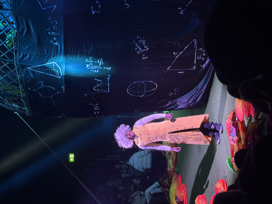 The image depicts an indoor theatrical or performance event within a structure in Bretton, United Kingdom, possibly a circus tent or stage venue. A male performer, appearing to be of Black ethnicity, stands center-left on a dimly lit stage. He wears a voluminous, light-colored Afro-style wig, a long, mustard-yellow, buttoned vest over a light-colored long-sleeved shirt, dark trousers, and dark boots. He faces slightly right, looking towards the audience, under multiple spotlights that cast a soft glow on him and a shadow behind him. To his right, a tall, dark fabric backdrop is visible, resembling a blackboard covered in various white handwritten-style scientific and mathematical equations, diagrams, and symbols, including chemical structures, geometric shapes (cone, sphere, triangle), and formulas such as E=mc². A distinct blue spotlight illuminates a section of this backdrop. Above the stage to the far left, a green exit sign with a white running figure is clearly visible. A thin cable or wire extends diagonally across the upper left. The stage floor is a muted green/grey, with several brightly colored, crumpled fabric items in shades of orange, red, yellow, and green scattered on it, particularly to the performer's left and in the immediate foreground. An audience is seated in tiered rows in the dimly lit background to the left and partially obscured in the immediate foreground, observing the performance. One audience member in the mid-left background wears a cream-colored puffer jacket. The overall environment is dark, contrasted by the focused stage lighting.