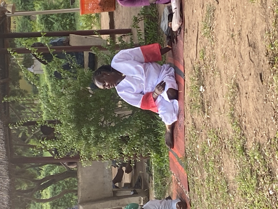 A woman in a white robe with red cuffs sits on a red mat in a grassy area. She is barefoot with her legs folded under her. A bush or small tree is behind her. Other people are visible in the background, some under a shaded structure. A few are also wearing white clothing. The scene appears to be outdoors during the day.