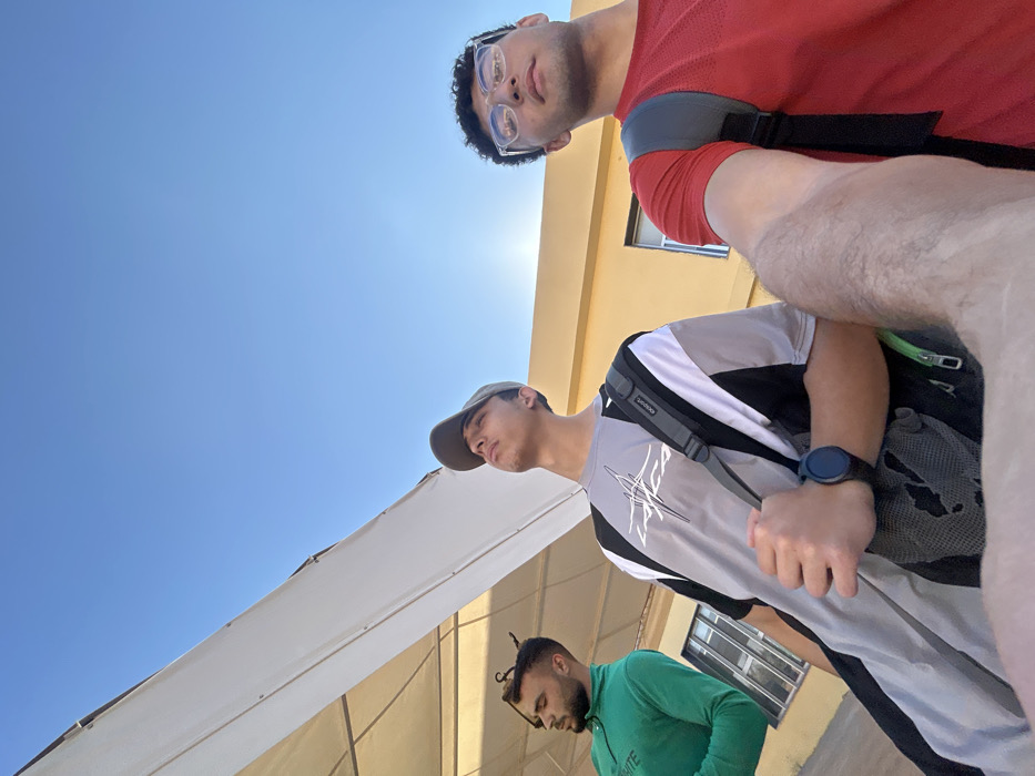 An outdoor scene in Jibb as-Safa, Syria, depicts three males under a clear blue sky with bright sunlight, indicating daytime. A white awning structure is visible on the left, extending upwards. A building with a light yellow/ochre facade and windows is present in the background on the right. From left to right: 1. **Male 1:** An adult male with short dark hair and a beard, wearing a long-sleeved green polo shirt. His eyes appear closed or are directed downwards, with his head slightly bowed. 2. **Male 2:** A young adult male wearing a grey baseball cap, a grey, white, and black color-block t-shirt with a graphic design, and a black backpack. He has a black smartwatch on his left wrist and holds a backpack strap with his right hand. His head is tilted upwards, and his eyes are open, looking towards the sky. 3. **Male 3:** Partially visible on the right, a young adult male wearing clear-framed glasses and a red short-sleeved t-shirt, with a grey backpack strap on his right shoulder. Only his head, upper torso, and part of his right arm are visible. His head is tilted upwards, and his eyes are open, looking towards the sky. This individual appears to be holding the camera that captured the image. The overall impression is that Male 2 and Male 3 are looking up towards the sun or sky, while Male 1's gaze is directed elsewhere or he is resting his eyes.