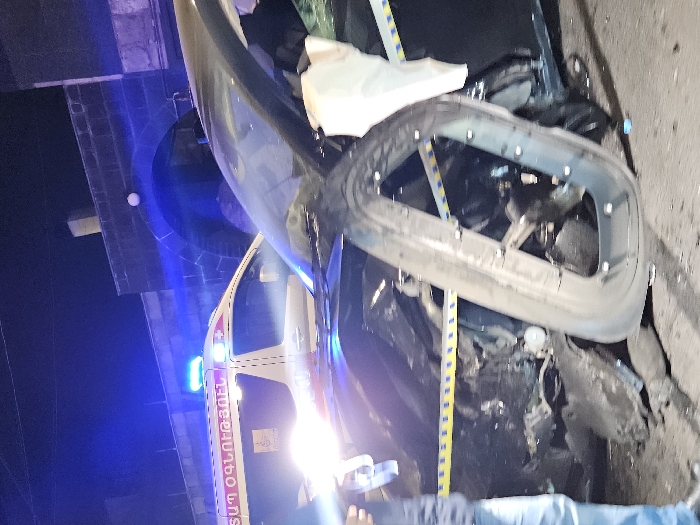 A night scene shows a severe car accident. The vehicle is heavily damaged, with parts scattered around. An ambulance is present, its emergency lights flashing. The scene appears to be located near a stone building or structure, possibly an archway, suggesting an urban or historic setting. The focus is on the wreckage and the emergency response, indicating a potentially serious incident.