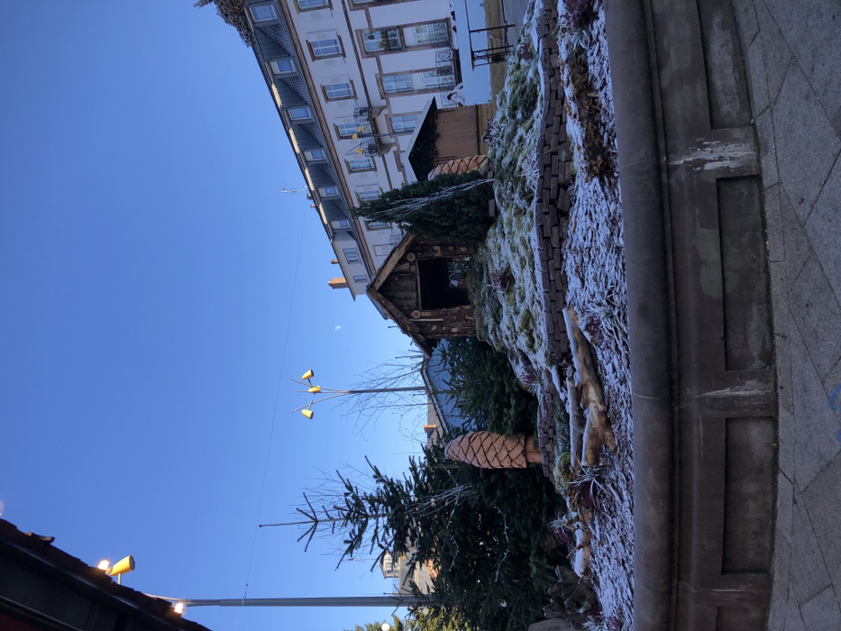 The image depicts an outdoor winter scene in the city of Saverne, France, under a clear, bright blue sky with a visible crescent moon. The foreground features the dark grey, rounded edge of a large stone basin or planter, topped with a light dusting of frost or snow, and resting on grey paved ground. The central focus is a raised, landscaped display mound, also covered in a thin layer of white frost or snow over green moss and some reddish foliage. Atop this mound stands a rustic, miniature wooden hut with a dark, slatted roof and an open front, suggesting a nativity or seasonal display. To the left of the hut, a large, carved wooden sculpture shaped like a pinecone is prominently positioned. Numerous coniferous trees, varying in size, are arranged around the mound and to its left, some exhibiting minor decorations. Scattered natural elements like fallen branches and logs lie on the frosty ground around the base of the mound, which is partially encircled by a low, brick-like wall. In the mid-to-background, behind the display, a multi-story building with a light-colored facade, numerous windows, and multiple balconies is visible, topped with a dark, dormered roof. To the right of the main hut, a second, smaller rustic wooden structure and a partially visible white, possibly sculpted, figure are present. A simple table with metal legs stands further right. A tall lamppost with three yellow-shaded lights is positioned to the left of the central hut, and another similar lamp is visible further right, closer to the building. No individuals are present in the scene.