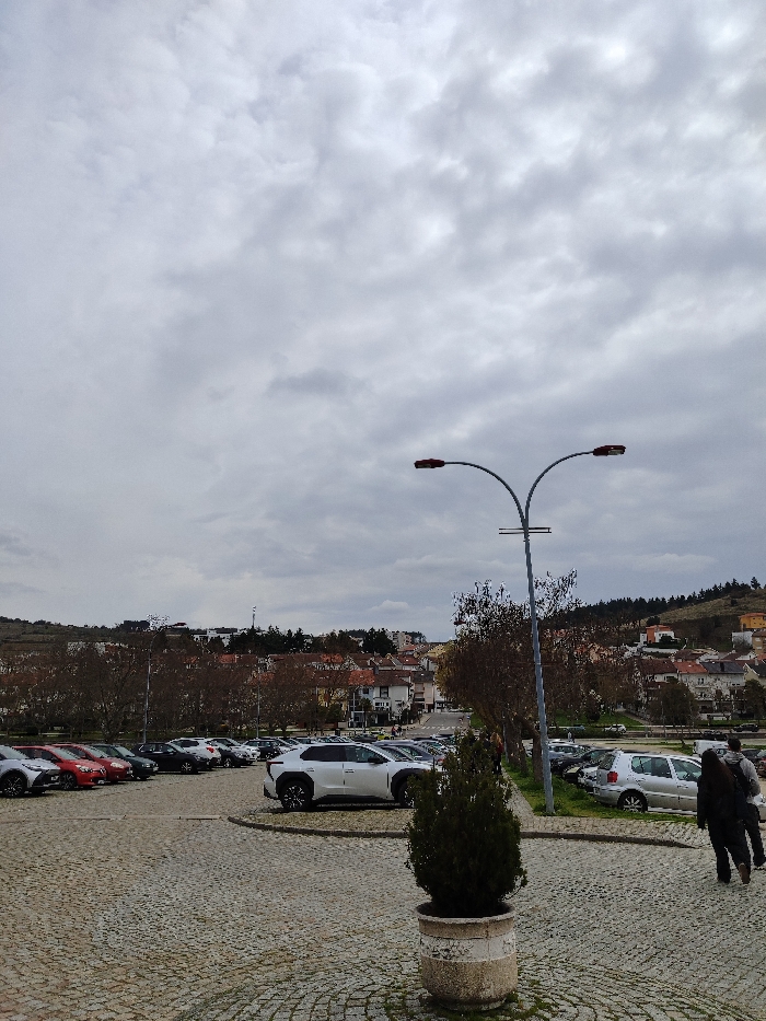 This image depicts an outdoor urban scene in Bragança, Portugal, specifically a large, cobblestone-paved public parking area, likely Largo do Castelo or an adjacent square, with a view overlooking the city. The sky is uniformly overcast with grey clouds. In the immediate foreground, a dark green coniferous plant is situated in a weathered, light-colored concrete planter. Directly behind and to the left of the plant stands a tall, silver-grey street lamp post with two upward-curving arms, each topped with a reddish-brown light fixture. The midground is dominated by a densely packed parking lot on the left and center. Numerous vehicles are parked, including a prominent white SUV/crossover positioned horizontally. Behind it are multiple rows of diverse cars, featuring models in red, dark grey, black, and silver. To the right of the street lamp, two individuals are seen walking away from the camera. The person on the left has long dark hair and wears dark clothing, while the person on the right wears a lighter-colored top and dark trousers. The background presents a residential section of the city, characterized by numerous multi-story buildings with white or light-colored facades and red-tiled roofs. Deciduous trees with bare branches and some evergreen foliage are scattered throughout this urban landscape. Beyond the residential area, hilly terrain rises, covered with sparse vegetation and additional structures. The overall lighting is diffuse due to the overcast conditions.