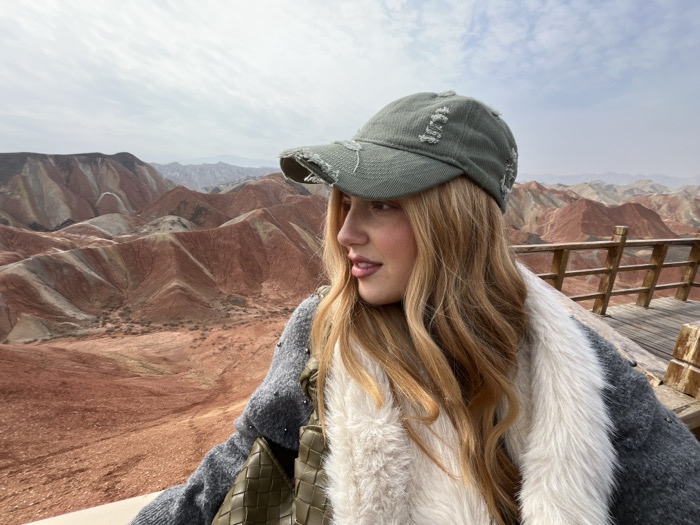 The image captures a female individual positioned in the foreground, slightly to the left of center, against a panoramic view of the Zhangye Danxia National Geopark in Zhangye, China