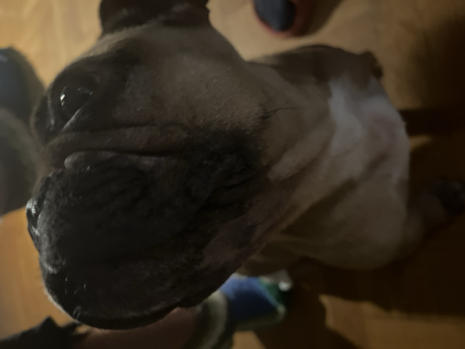 A close-up shows a bulldog's face with a dark muzzle and wrinkled brow. One eye is visible, reflecting light. The dog's fur is a mix of brown and white. The foreground features a hint of fabric, possibly clothing. The background consists of a dark, possibly wooden floor. The lighting seems dim and uneven, creating shadows that emphasize the dog's features. The angle of the shot is slightly from above, giving the viewer a perspective as if looking down at the dog.