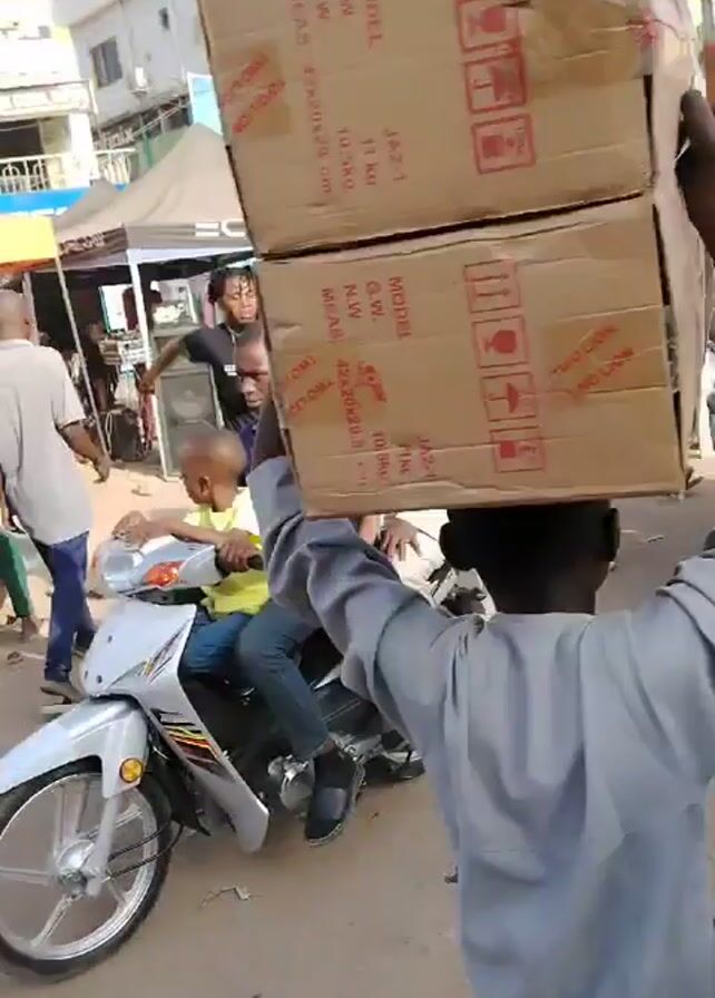 bustling street scene in what appears to be a West African city. In the foreground, a man, a boy, and a baby are seated on a small motorbike. The baby sits in front, being held by the man, while the boy sits behind him. Next to them, a yellow auto rickshaw, locally known as a "Keke," is parked. It is transporting passengers, some of whom are children. A woman in black clothing is dancing in the street near the Keke. In the background, there are several people walking around, some of whom are dressed in traditional African attire. There are also market stalls with tents, posters advertising Infinix smartphones, and other commercial advertisements. The overall environment suggests a busy marketplace or a public gathering.