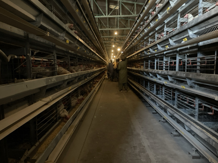 This image displays the interior of a commercial poultry farming facility in Shuyene Vosta, Afghanistan