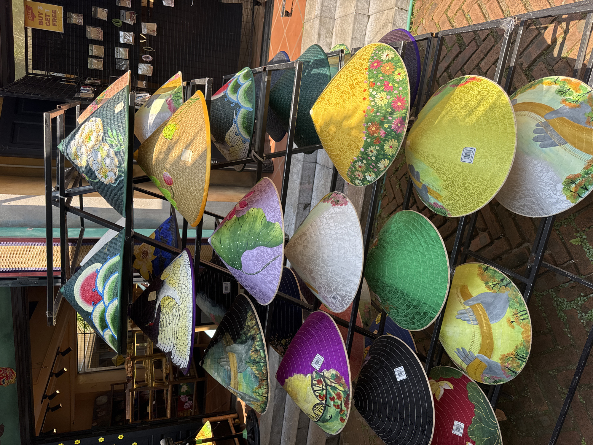 display of traditional Vietnamese conical hats, known as "nón lá," hanging on a black metal rack in what appears to be a shop or market in Đà Nẵng, Vietnam. The hats are decorated with various colorful designs, including floral patterns, landscapes, and abstract motifs. The background shows stone steps and brick walls, suggesting an outdoor or semi-outdoor setting. A "Buy 3 Get 1 Free" sign is visible in the upper left corner.