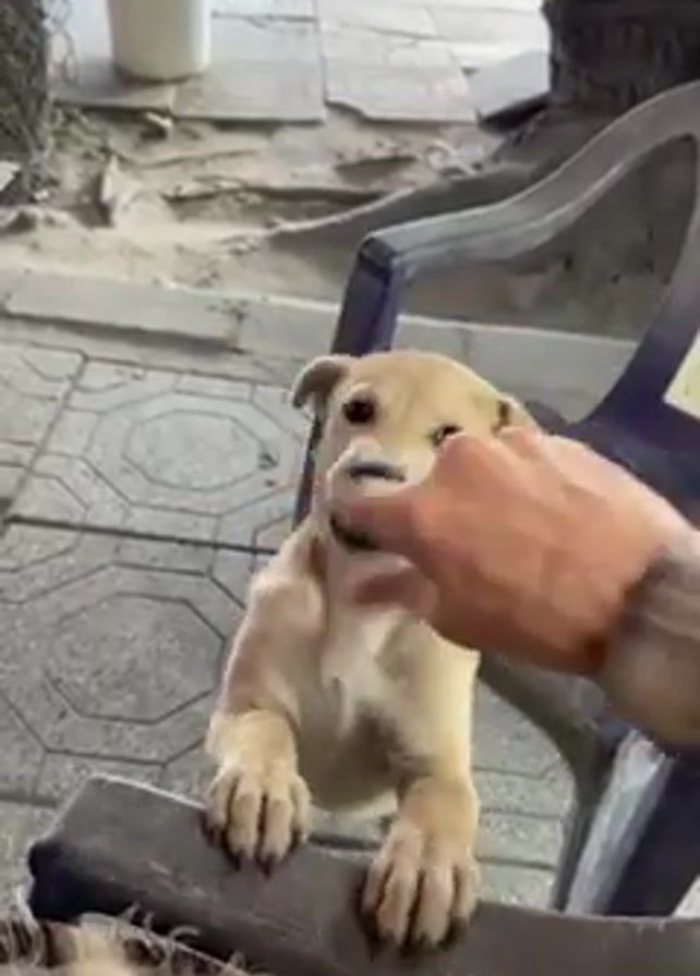 A short video shows a small, light-brown puppy outside a building with red plastic chairs and a white bucket visible in the background