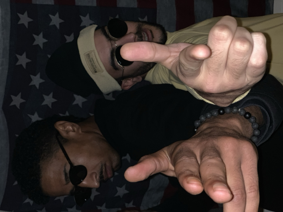 Two men lie on a flag. The man in the foreground has dark skin, wears round sunglasses and a black shirt. The other man has light skin, wears sunglasses, a beige beanie, and a light yellow shirt. They both extend their hands toward the viewer. The man in the foreground wears a black beaded bracelet. The flag appears to be patterned with stars.