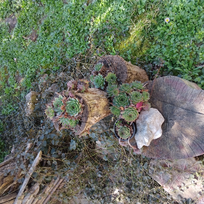 The scene depicts an outdoor garden area located in the city of Levski, Bulgaria, illuminated by direct daylight. Multiple clusters of Sempervivum succulents are the primary subjects, arranged on and within weathered tree stumps. A prominent, hollowed tree stump towards the upper-center contains numerous green succulent rosettes. To its right, a shorter tree stump also holds several smaller succulent clusters. In the lower-left foreground, a flatter, wider tree stump supports a large, irregular light-colored rock. A single succulent rosette in a small black plastic pot rests on this rock. Adjacent to the rock, a dense cluster of succulents, exhibiting greenish-red foliage, is situated on the lower stump. The ground on the right side of the frame is covered by vibrant green ground cover, featuring one visible white daisy flower. The left background displays a mix of darker, tangled ground cover, dry branches, and a pile of pale wooden slats or debris. Distinct shadows are cast, indicating strong sunlight. No human figures are present.