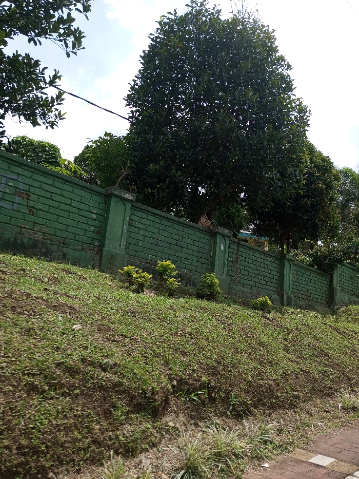 The image depicts an outdoor scene in Viengthong, Laos, captured under daylight conditions. In the foreground, a grassy embankment slopes upwards from the bottom of the frame, showing patches of sparse green grass and exposed soil. A section of a reddish-brown brick sidewalk with light-colored rectangular inserts is visible at the lower right. Thin, variegated green and white plants grow sparsely along the edge of the sidewalk and at the base of the embankment. A dark green brick wall, approximately 1.5 to 2 meters high, extends horizontally across the midground at the top of the embankment. The wall features regularly spaced vertical pillars, also painted dark green, which show signs of minor wear and discoloration, particularly near their bases. Three small, bushy plants with bright yellowish-green foliage are positioned at intervals along the base of the wall on the grassy slope. Behind and above the wall, numerous large, verdant trees with dense canopies occupy the upper half of the frame, suggesting a treeline or forest behind the wall. The sky above is partially visible, showing light blue patches interspersed with white clouds. A dark, thin cable or power line stretches horizontally across the upper left quadrant of the sky. No individuals or discernible actions are present in the scene.