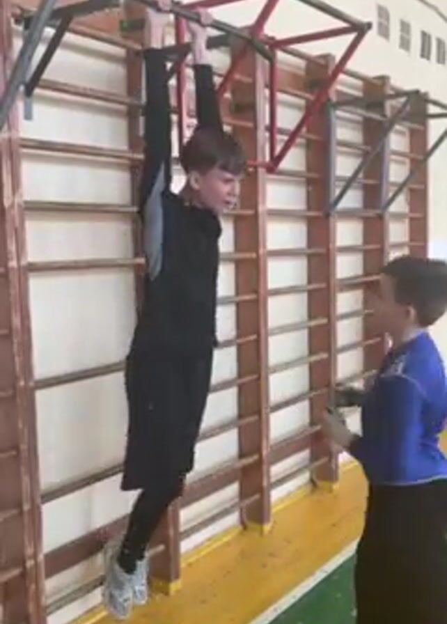 Two young people are in a gymnasium. One person hangs on a horizontal bar and tries to do a pull-up. The other person punches him in the stomach as he does the pull-up. The gym is painted white with a yellow floor. There is a wall-mounted wooden climbing ladder behind the horizontal bar. The person hanging on the bar is wearing a black tracksuit with gray stripes on the shoulders and light gray shoes. The other person wears a blue jacket with black pants.