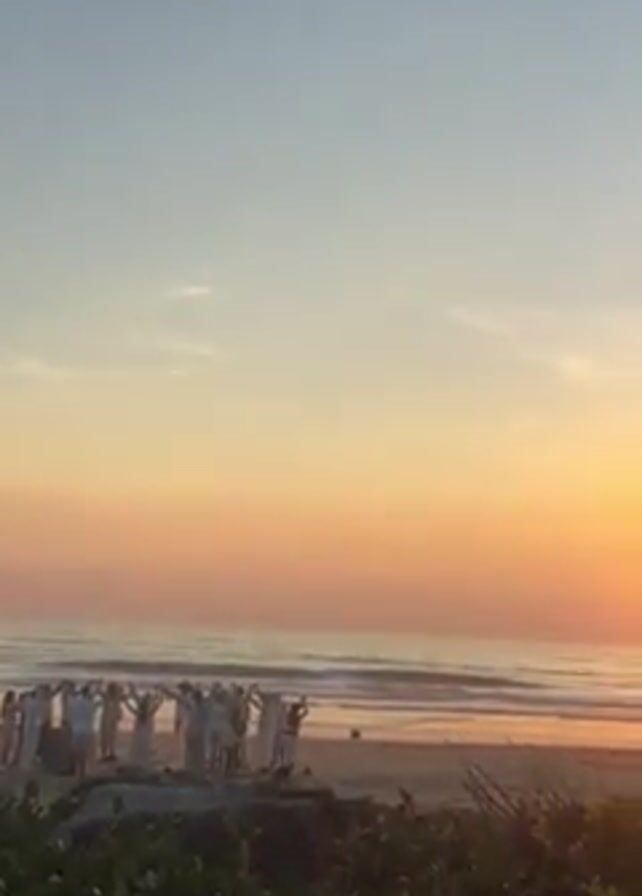 group of people on a beach at sunset. The sky is a gradient of orange, pink, and blue. The sun is setting over the ocean, casting a golden glow on the water and sand. The people are standing in a circle, holding hands with their arms raised. They are all wearing white clothing. Some bushes are in the foreground, partially obscuring the view of the beach.