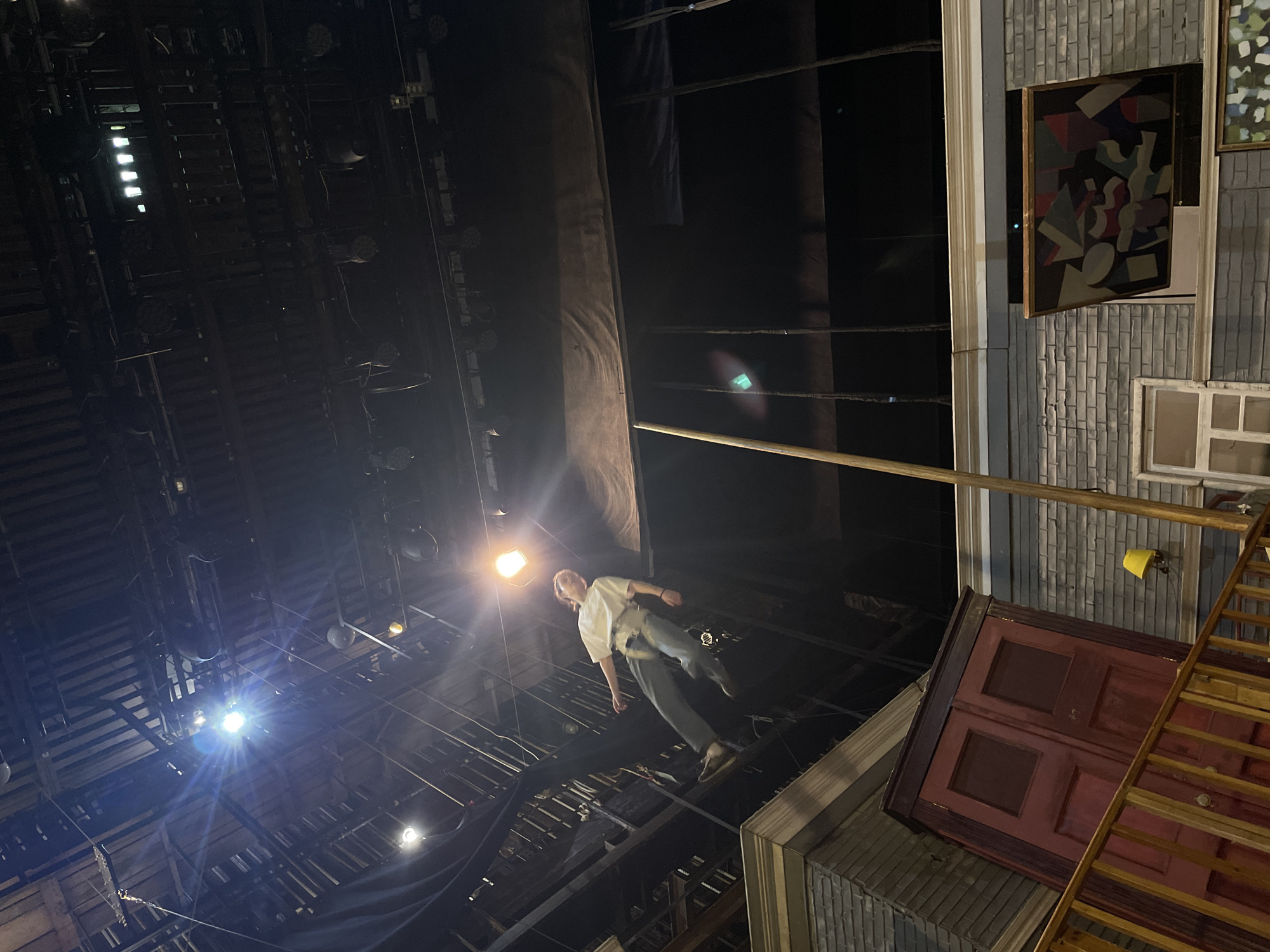 The image depicts an intricate theatrical stage setup, viewed from a low angle, within the Moscow Art Theatre (МХАТ) in Moscow, Russia. A single individual, appearing young with medium-length dark hair, is suspended horizontally in mid-air, positioned centrally in the upper midground. The person is wearing a light-colored, short-sleeved t-shirt, light blue jeans, and light-colored shoes. Their arms are slightly outstretched and legs slightly bent, indicating an aerial maneuver, likely facilitated by harnesses and wires connected to the overhead rigging, which are mostly obscured by clothing and lighting. The lower portion of the frame features detailed theatrical set pieces designed to resemble building facades. On the left, an angled section shows a dark red double door with recessed panels, partially obscured by a wooden railing in the immediate foreground. Above the door, a shingled roof-like structure is visible. To the right, a gray facade with a textured, shingle-like surface features a white-framed window. Further right on this facade, a framed abstract painting, composed of geometric shapes in various colors, appears to be partially set into or leaning out of an opening. A yellow, cone-shaped wall sconce is mounted on the gray facade. Two slender, light-colored vertical poles extend upwards from the set pieces towards the ceiling. The upper two-thirds of the image reveal the extensive overhead theatrical rigging, comprising numerous metal beams, trusses, wires, and dark fabric masking. Multiple stage lights are mounted throughout this structure, with several emitting bright, star-burst lens flares that illuminate the suspended person and parts of the rigging. The overall lighting creates a dramatic contrast between brightly lit areas and deep shadows, highlighting the technical infrastructure of the stage environment.