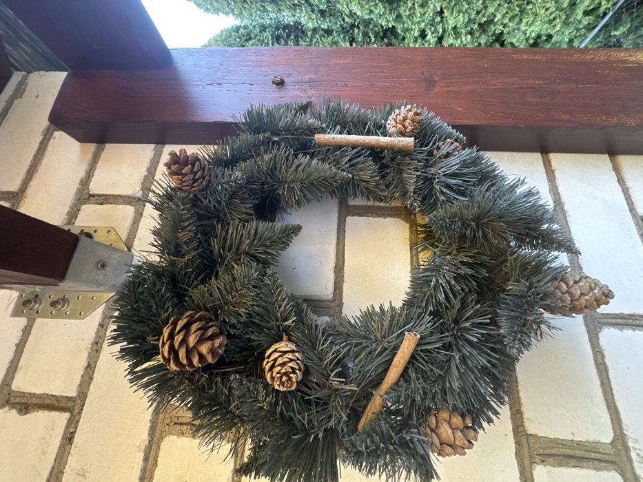 - "The image displays an artificial dark green wreath adorned with multiple light brown pinecones and at least two cinnamon sticks" by FM-osXZC2, licensed under CC BY 4.0