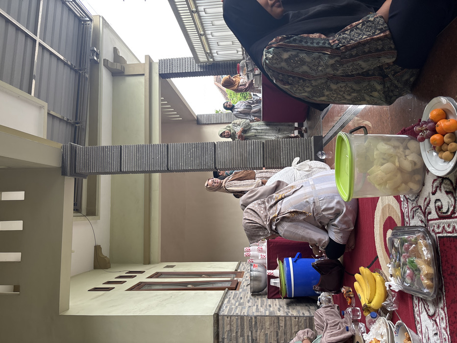People gather inside a building with an open-air courtyard. Some individuals are seated on a red rug, surrounded by food, including bananas, fruit, and snacks in containers. A beverage dispenser and cups are nearby. Other people stand near a red table. The architectural design features a unique bridge-like structure.