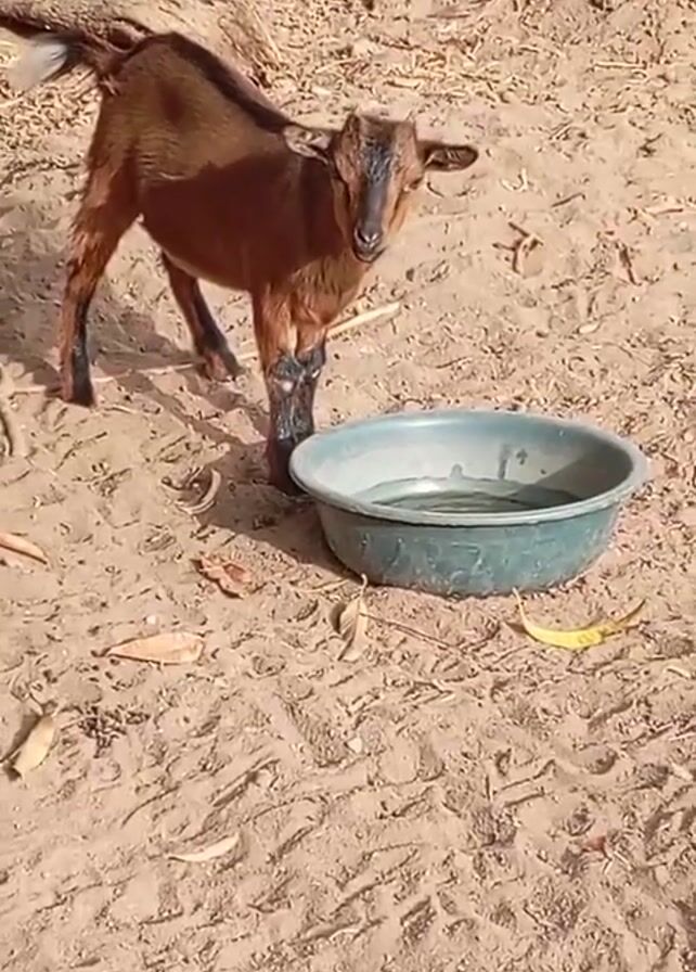 - "young, brown goat standing in a sandy environment next to a green plastic bowl filled with water" by FM-BfMp72, licensed under CC BY 4.0