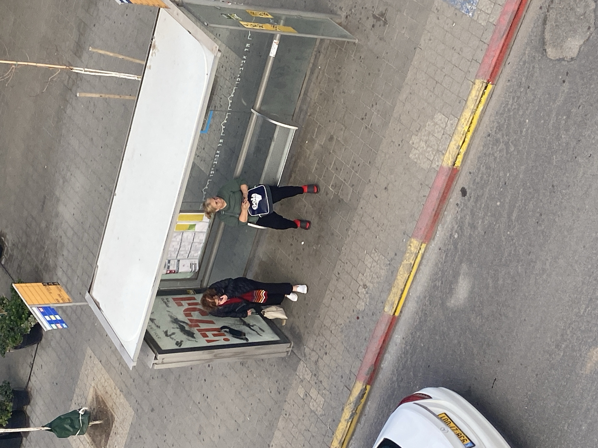 The image presents an overhead view of a bus stop in Tel-Aviv, Israel. Two women are present. One woman, positioned within the sheltered area of the bus stop, is lying prone on the surface of the bus stop advertisement board, wearing a black jacket, red and yellow sweater, and black pants with white socks. Near her is a light-colored purse. The other woman is sitting on the bench, dressed in a green top, black pants, and red slippers, with a navy blue bag displaying "GOLA." The bus stop structure is a metal and glass enclosure with advertisements. Adjacent to the bus stop, a section of sidewalk is marked with red and yellow curbs. The edge of a white car with a license plate is visible on the street. The location is urban, with tiled pavement.