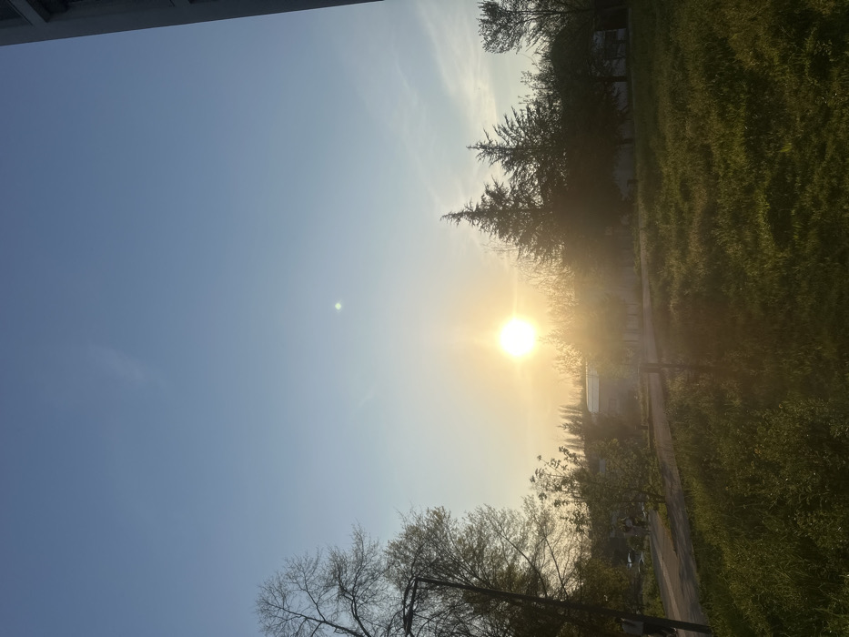 The image depicts an outdoor scene in Guimarães, Portugal, illuminated by the low sun positioned slightly left of the frame's horizontal center, indicating either early morning or late afternoon. The sky is clear and blue, with faint atmospheric haze visible. The immediate foreground consists of densely vegetated grass with varying shades of green, suggestive of a park or open field. A dark, paved pathway or road traverses the mid-ground from left to right. Along this pathway on the left, several human figures are visible in silhouette, appearing to walk towards the viewer's left. Various trees are present throughout the mid-ground and background; on the left, deciduous trees with visible branches and new foliage, and on the right, several taller, dark green coniferous trees. In the distance on the left, a light-colored structure with a reflective roof, possibly a greenhouse or industrial building, is partially visible. The upper right quadrant reveals the stark, light-colored facade of a multi-story building, likely an apartment complex or office structure, with visible window lines.