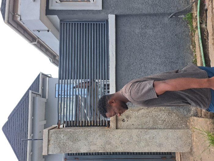 The image, set in Moba, Nigeria, depicts an adult male subject walking from left to right in the foreground. He has dark skin, short dark hair, and a beard, and is wearing a dark brown short-sleeved t-shirt and blue jeans. To his left, a textured light grey concrete pillar is partially visible. Behind the subject, a dark grey fence with horizontal slats separates the foreground from the background structures. In the background, two residential buildings with light grey stucco walls and dark grey roofs are visible under an overcast sky. The building on the left features a dark hip roof and a window reflecting a partial human torso wearing a light-colored shirt. The building on the right has a white-trimmed flat roof section and a white-framed window. The ground surface is paved, with sparse green vegetation and a green hose visible on the right.
